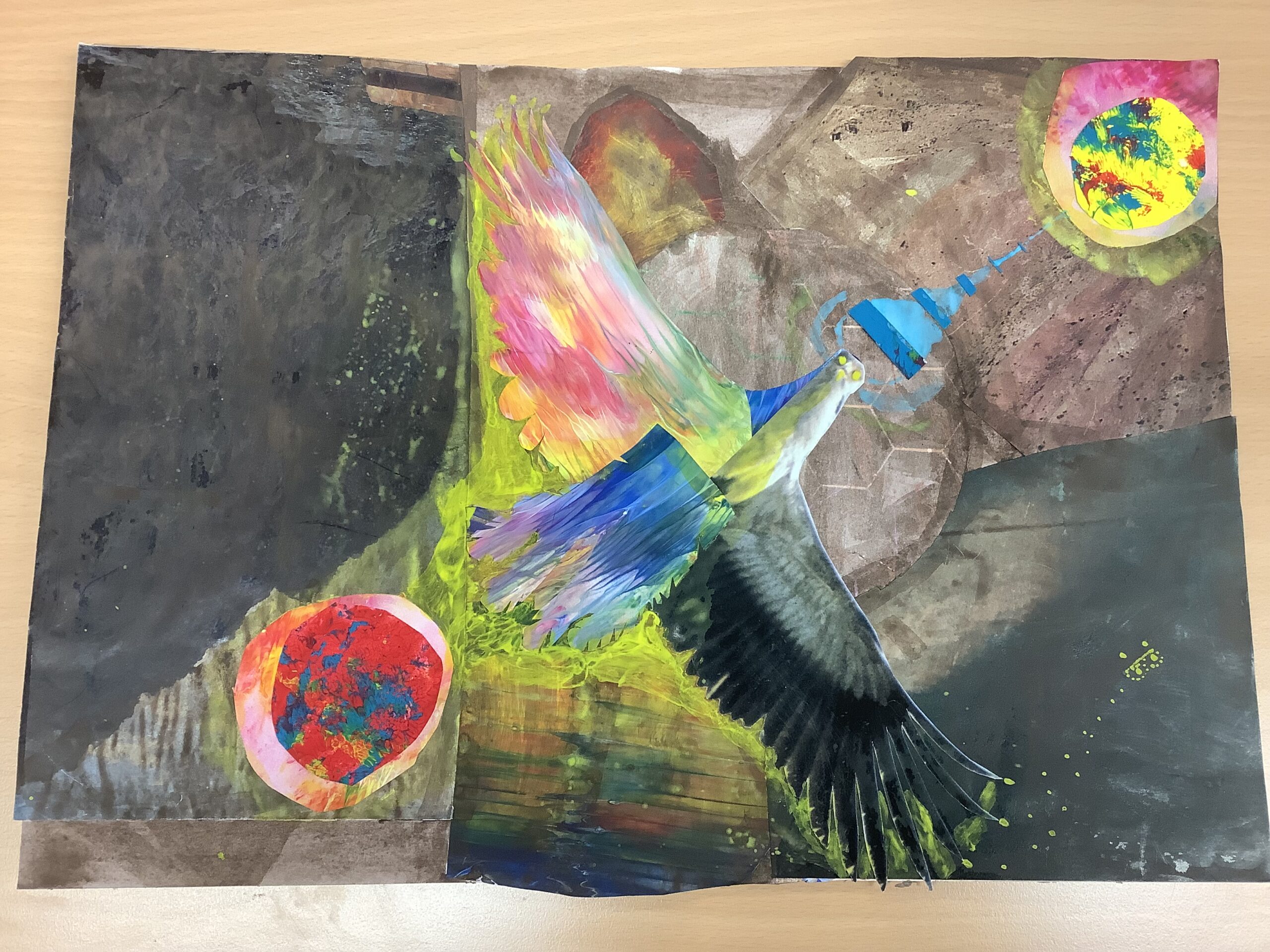 Inspiriert im Sinne des surrealistischen Manifestes beschäftigten sich die Schüler/innen des Grundkurses Q1 mit der Collage-Technik. Dabei experimentierten sie mit Zufall und Improvisation, indem sie die Spuren der Décalcomanie und Frottage-Verfahren mit Bildern und Elementen der naturalistischen Landschaft auf gemalten Hintergründen kombinierten.